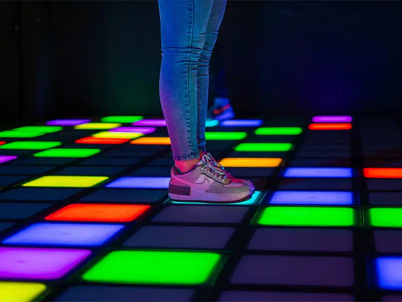 Mnogo različitih opcija za igranje poput otkrivanja boja na brzinu, pod je lava, igre memorije i drugih izazova koji testiraju tvoje reflekse, koordinaciju i timski rad. Igrači gaze na osvetljene kvadrate na podu, izbegavaju crvene kvadrate, zeleni su bezbedni, a plavi su poeni.